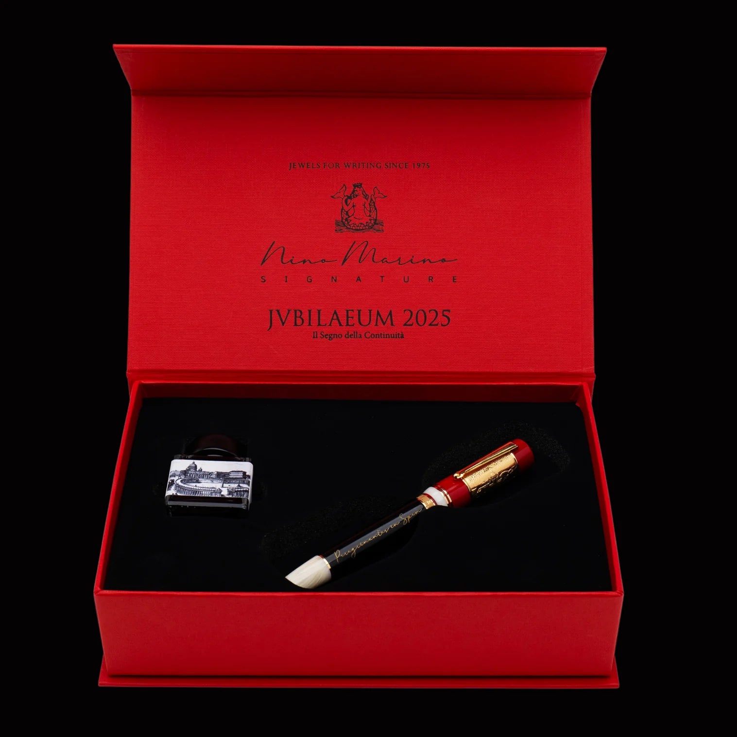 Limited to 188 pieces worldwide this gorgeous fountain pen features special resin hand turned from a solid bar as well as a solid sterling silver cap motif showcasing St. Peter's Basilica in high relief thanks to the ancient last-wax casting technique. The barrel is engraved with the motto of the 2025 Jubilee, "Peregrinantes in Spem" (Pilgrims in Hope).